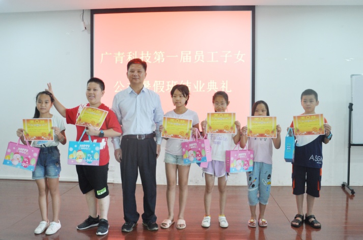 在结业典礼上,广青科技党委副书记、纪委书记、工会主席江华革给在暑假期间表现突出的孩子颁发了证书和奖品,并对暑假班的开办给予了充分肯定。他指出:公益暑假班既解决了家长的后顾之忧,又保障了学生安全和假期学习,这有赖于老师和工会组织以及综合部全体员工的共同努力,他们敢于担当,迎难而上,解决了一个又一个难题。公司工会也将继续做好员工服务工作,切实为员工办实事、做好事。