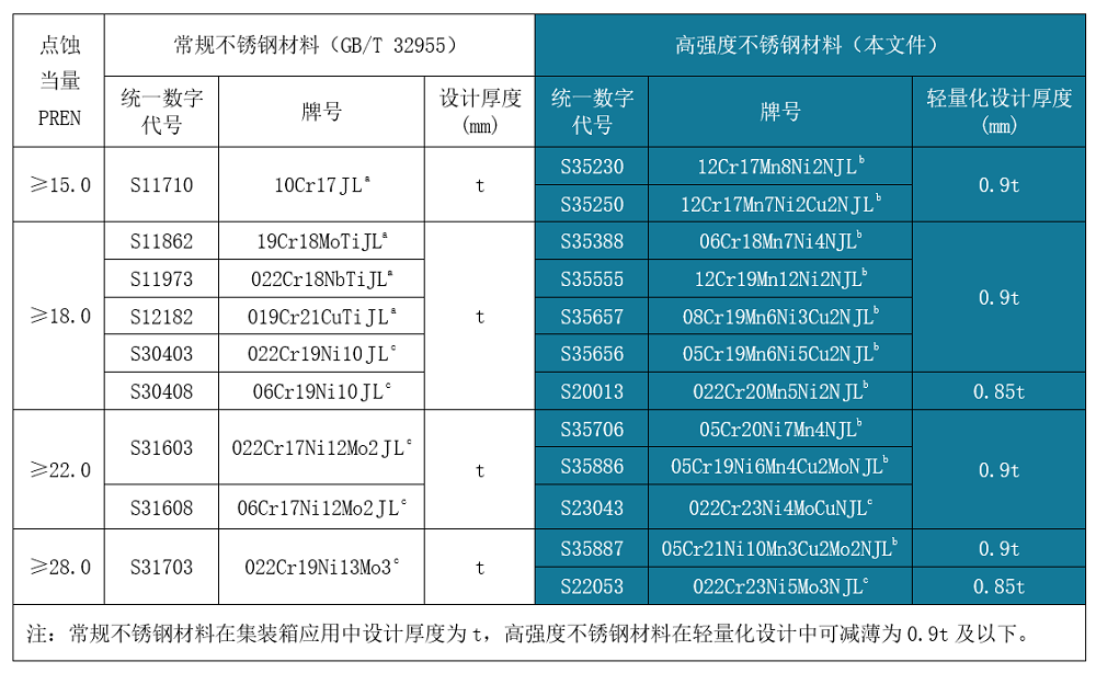 经济型高强度不锈钢,包括QN系列奥氏体不锈钢及QD2001双相不锈钢在保持良好耐蚀性、焊接性和冷加工性的基础上显著提升了强度,可助推集装箱及家电等领域的产品轻量化设计。新发布的行业标准中推荐,高强度不锈钢相对常规产品可减薄10%-15%(详见表1~表3),这对于产业链节能减排和可持续绿色发展具有重要意义。